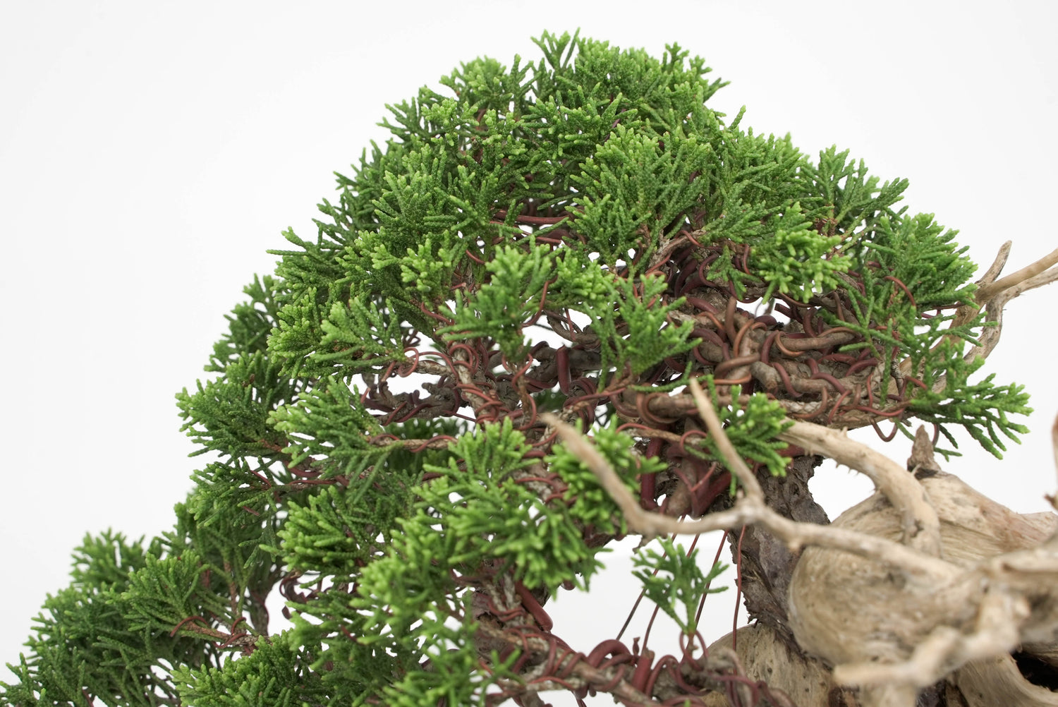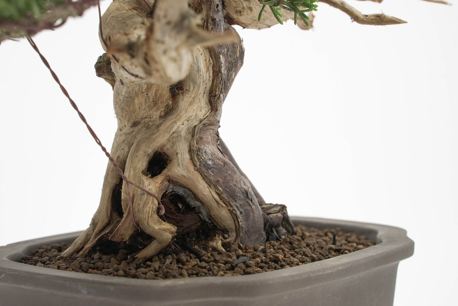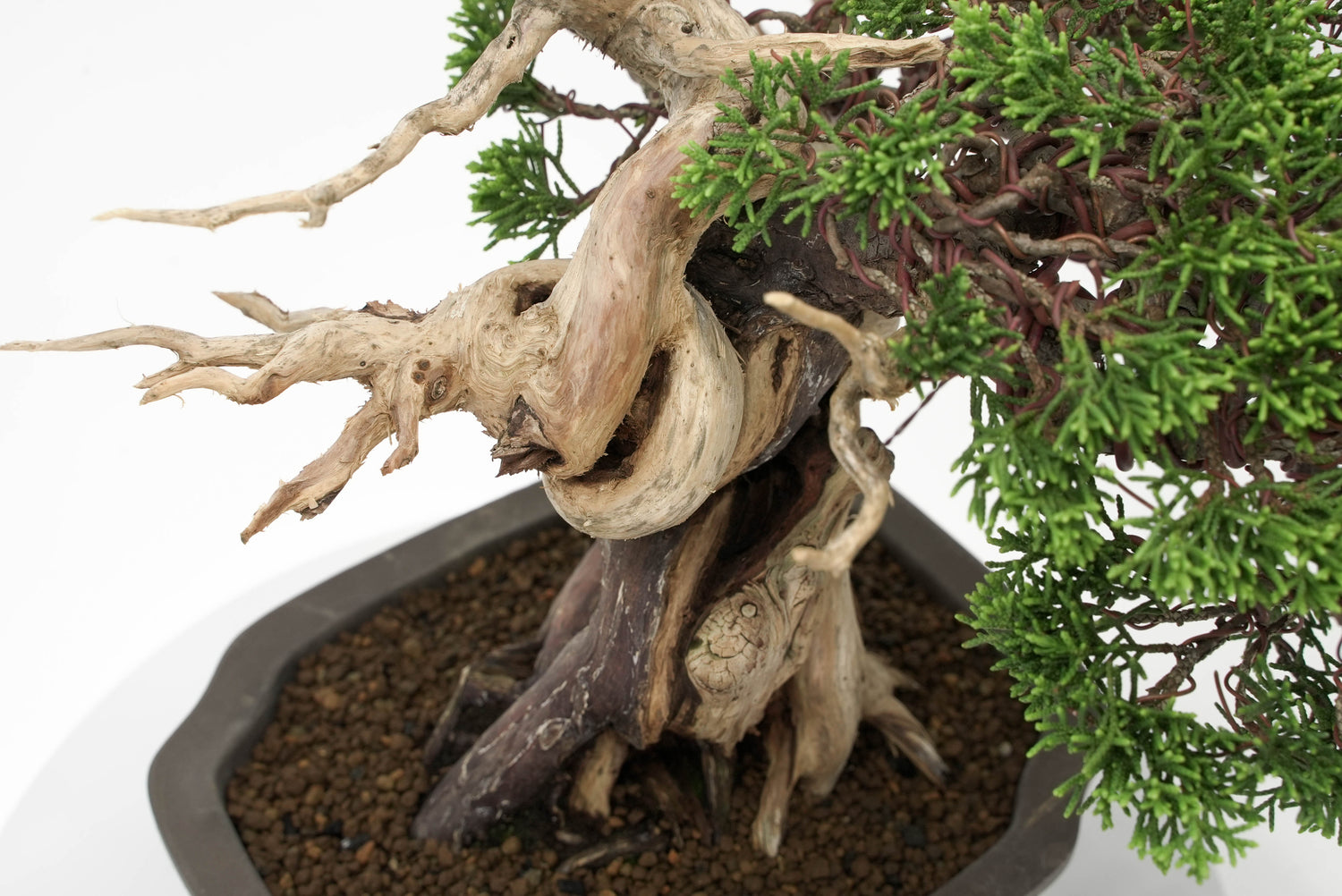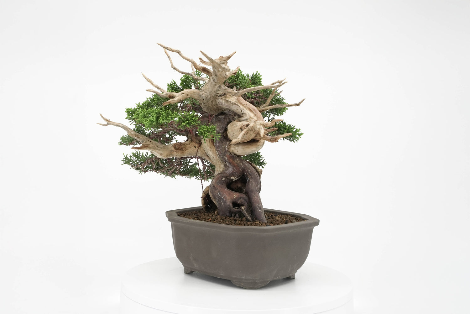 幹中間部で捻転し、舎利が効いた様は自然界の厳しさが表現され、大木感も感じられる逸品