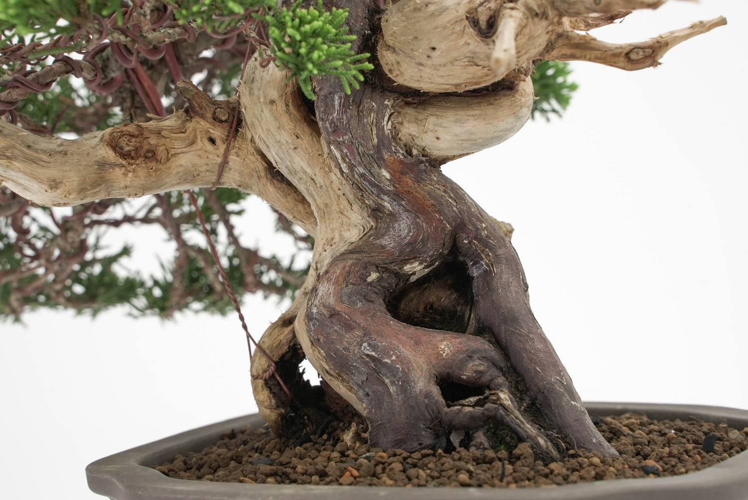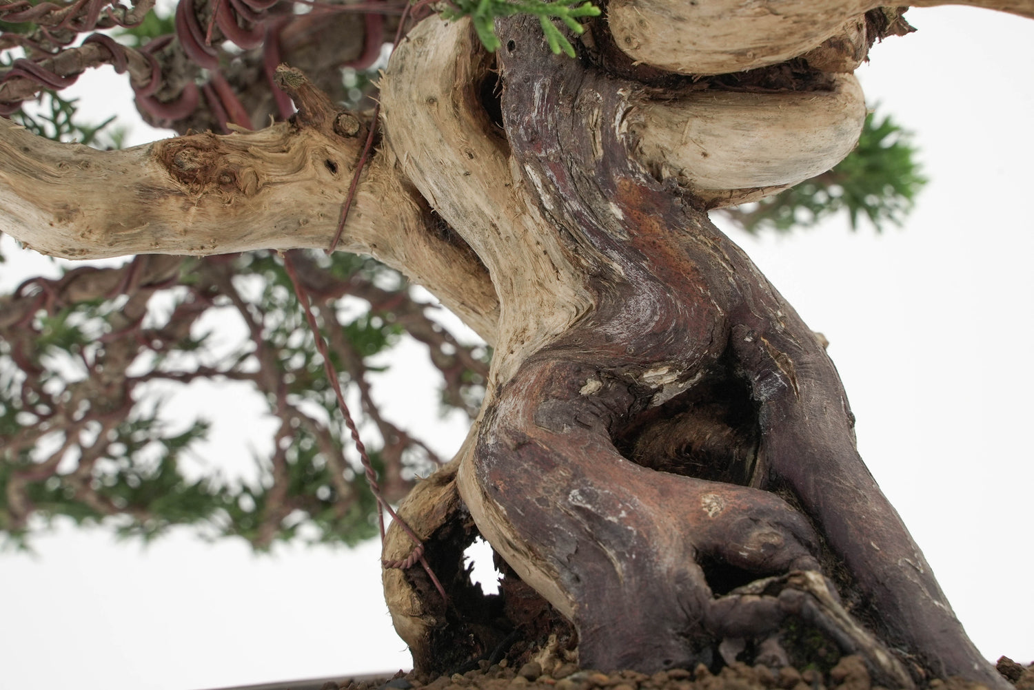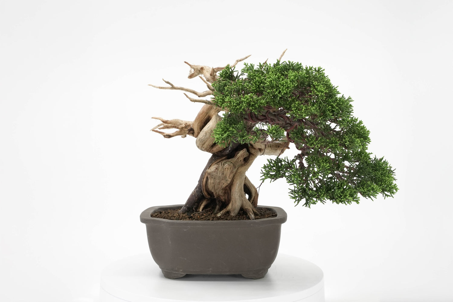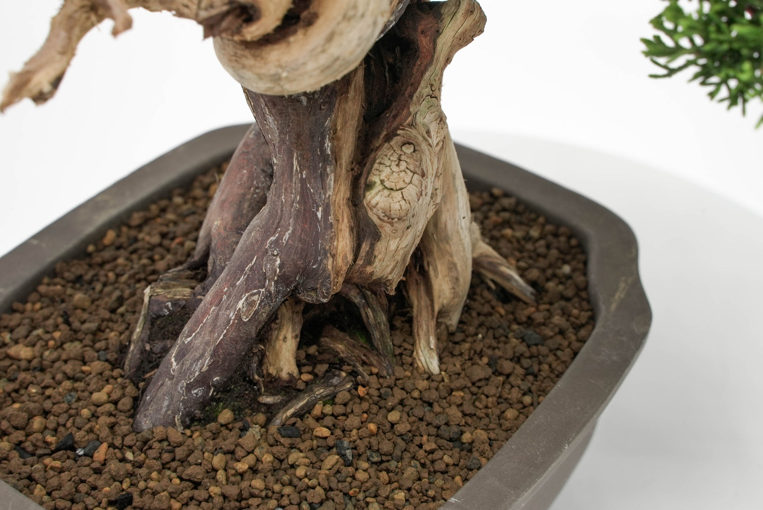 幹中間部で捻転し、舎利が効いた様は自然界の厳しさが表現され、大木感も感じられる逸品