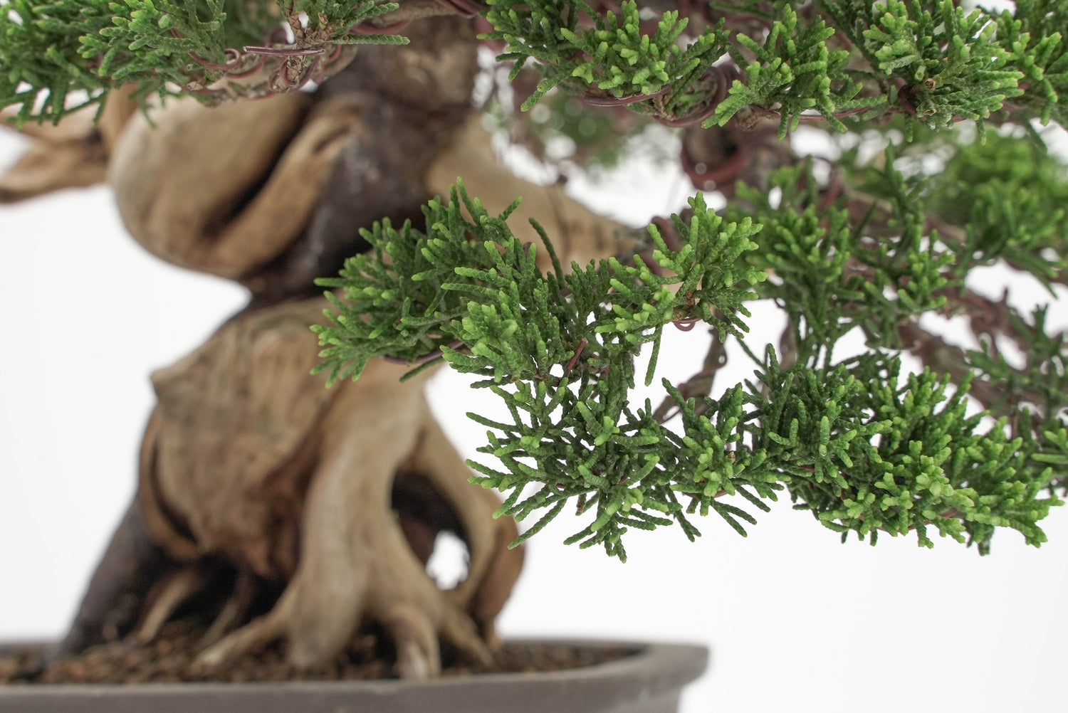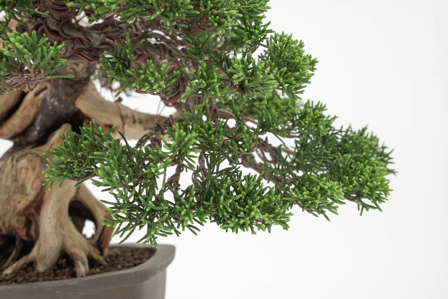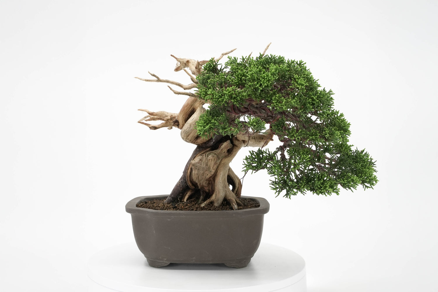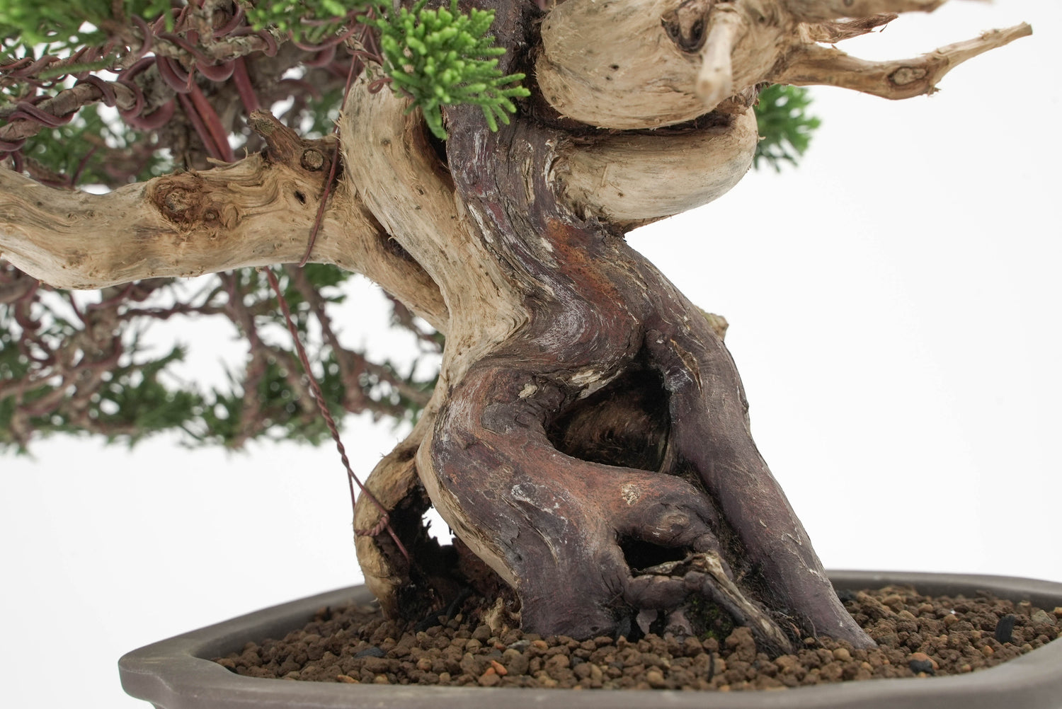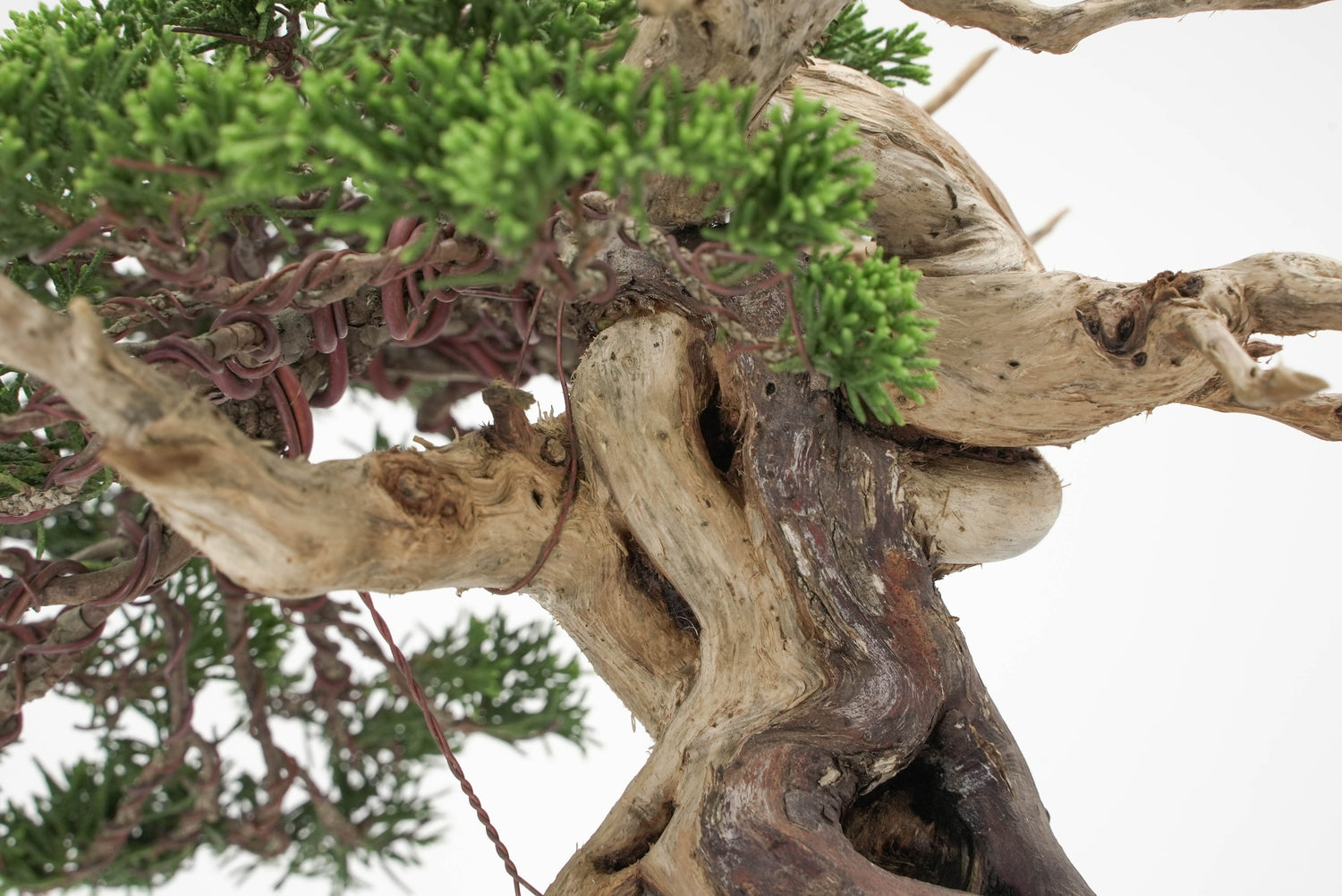 幹中間部で捻転し、舎利が効いた様は自然界の厳しさが表現され、大木感も感じられる逸品